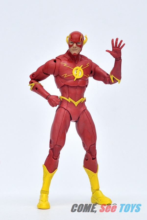 Articulation. The Flash has a dumbbell joint neck, ball hinge shoulders, butterfly joints with up and down movement, bicep swivel, double jointed elbows, revolver joint wrists, ball joint torso, ball joint waist, peg hinge hips, a bit of thigh swivel at the hips, double jointed knees, revolver joint ankles and toe hinge. He can look up and down a little. A peg hinge would be better here so he can look up more when in a full run. The butterfly joints go back more than they go front. The bicep swivel is hindered by the sculpt. You can still force it to turn. The elbows have very good bend. He can only bend forward a bit. He can bend back and to the sides more.