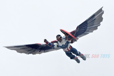 There's a new Cap in the MCU and he's looking pretty good. I like the look and the colours. This is a lot more Captain America-ish than the costume John Walker wore. And thankfully this figure is a lot more show accurate. There's a good amount of detail on his costume. You can make out the design elements on it. The areas which are not padded is textured. The paint apps are quite poor. There's quite a bit of slop all over the place. His feet are a lot more shinier than the upper portion of his boots. I wish they were the same matte silver. The head sculpt is nice. I'm liking the translucent visor and the detail of his hair. Like with his costume, the paint apps here could be better. Another thing I feel that could be better is his size. He needs a bit more bulk. He looks fine on his own but when compared with other figures he looks a bit scrawny. He did seem bulkier in the show.