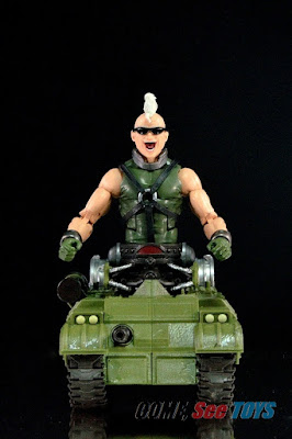 The olive green reminds me a lot of G.I.Joe vehicles. The tank body is a little small for the 3.75" figures but we can make it work. There's enough space in the opening for a figure to stand.